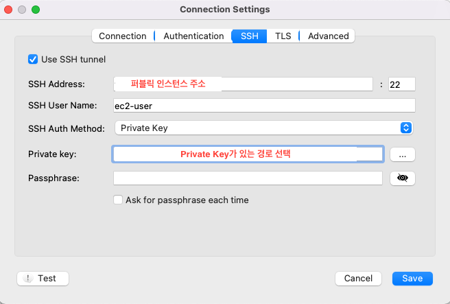 SSH Address, SSH User Name, Private Key를 입력해준다. 처음 입력할 정보는 Connection Settings > SSH 항목이다.