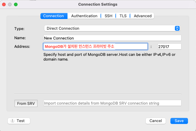 프라이빗 인스턴스에 설치한 MongoDB는 Robo 3T에서 포트만으로 바로 접속할 수 없다.