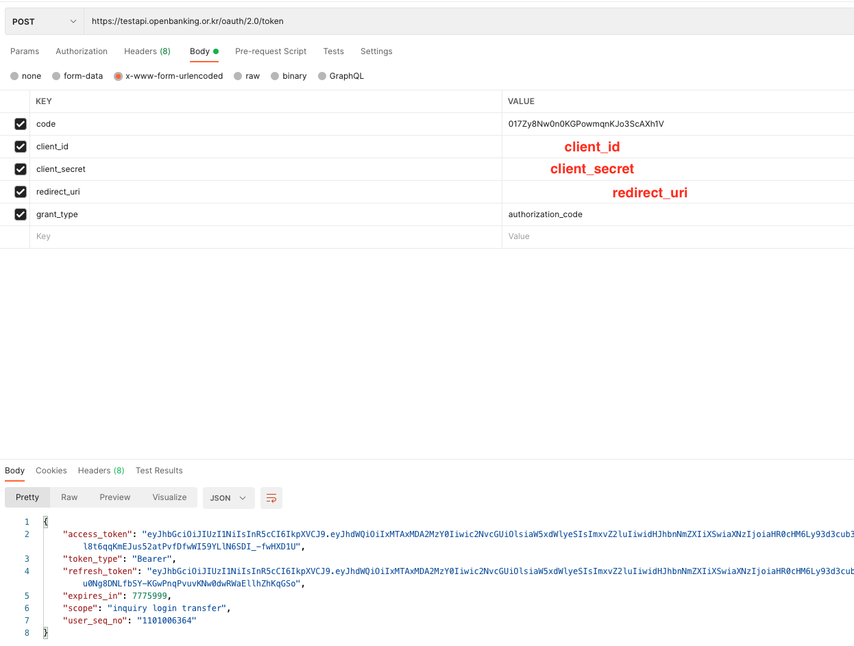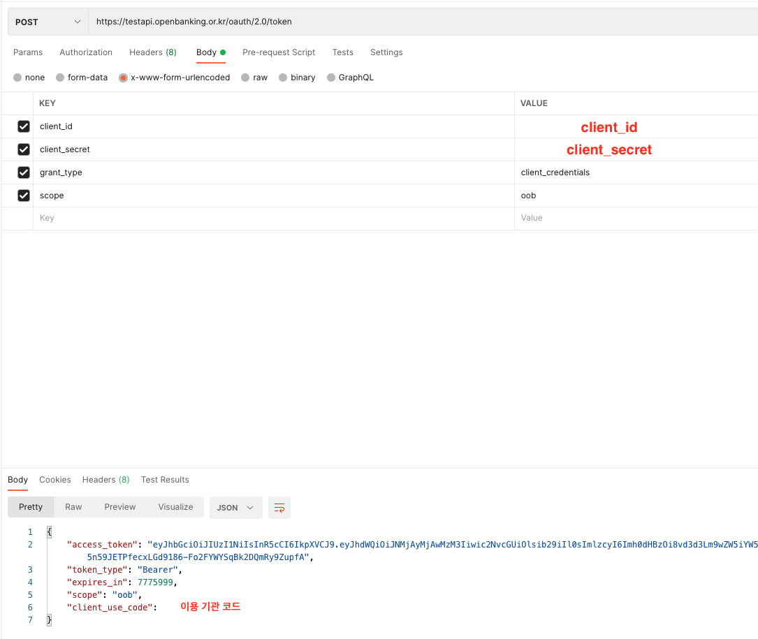 이용 기관 토큰 발급 이용 기관은 code, redirect_uri 값을 입력하지 않고 grant_type을 "client_credentials"로, scope을 "oob"로 고정 후 보내면 access_token과 client_use_code 값을 받을 수 있다.